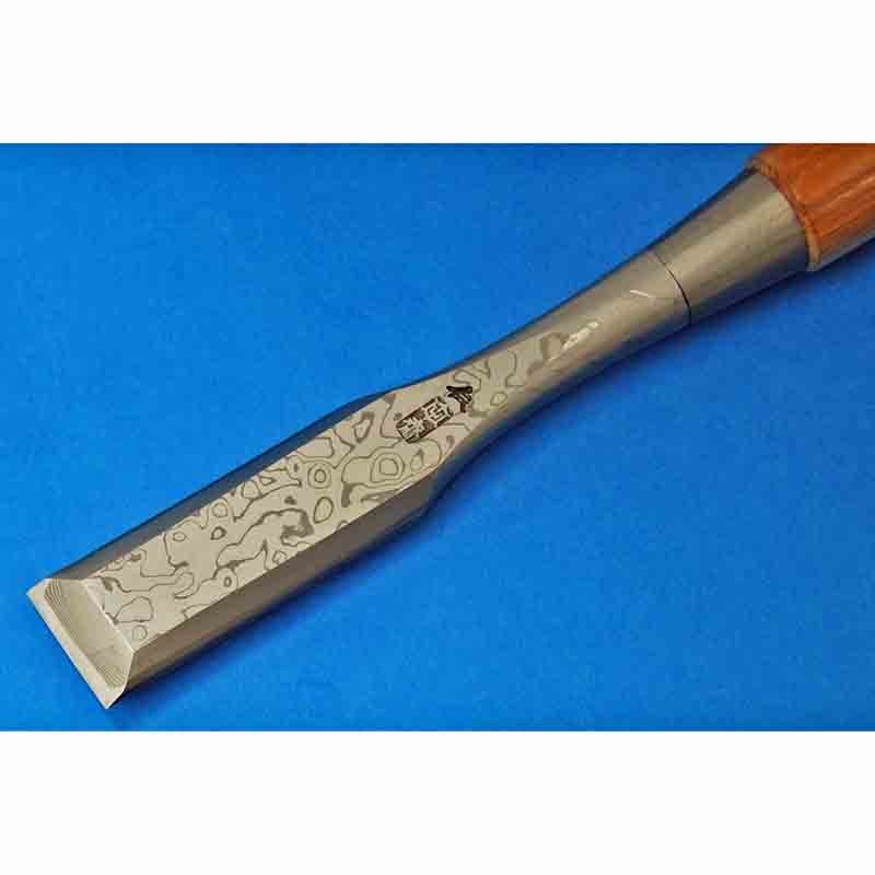 昔、武士は自分の魂といわれる刀を常に帯刀していた事にちなんで「脇差し鑿」と名付けられた鑿です。こちらは木目模様磨き仕上げ、欅柄付、皮制専用鑿差し付です。地金は古鉄、鋼は青紙を使用しています。鑿の肌に無数の模様と凹凸を出すことにより、他では真似できない独自の木目の仕上がりになっています。手で叩いて模様を出しておりますので、同じ模様は二つとありません。木目造りとは、地金(古鉄)を何回も合わせ打ちをして、文様をつくります。大変な手間と時間を使い、独特の美しい文様を出します。